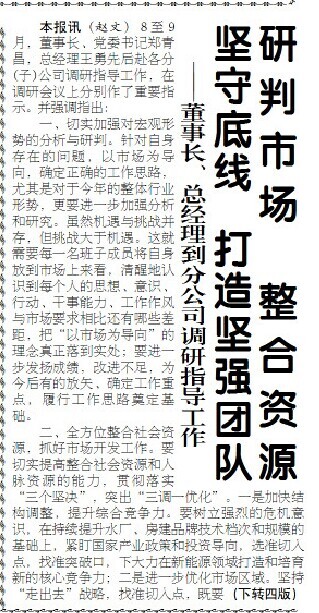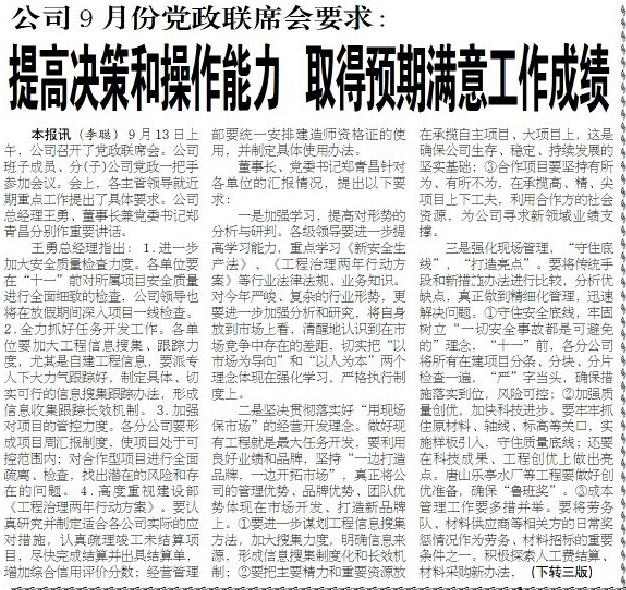 公司2014年9月份最佳文章评选结果揭晓 来源: 修改时间:2014.10.28 浏览:3703 公司2014年9月份最佳文章评选结果揭晓 根据各单位报送的评选结果并经公司评委会认真研究,2014年9月份《河北二建》和公司官方网站最佳文章是:2014年9月15日《河北二建》一版刊登的《研判市场 整合资源 坚守底线 打造坚强团队》,作者:赵文,单位:公司机关;2014年9月15日《河北二建》一版刊登的《提高决策和操作能力 取得预期满意工作成绩》,作者:李聪,单位:公司机关。 上一条 返回列表 下一条