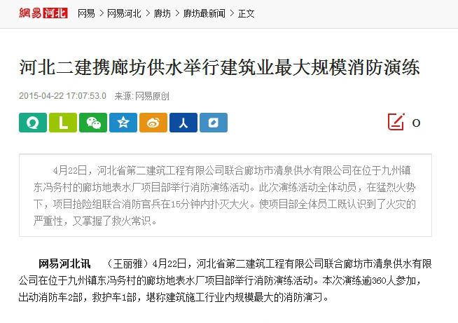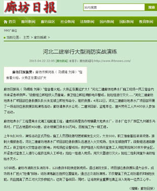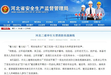河北新闻网等多家媒体报道我消防实战演练 来源: 修改时间:2015.04.23 浏览:7253 河北新闻网等多家媒体报道我消防实战演练 2015年4月22日,公司在廊坊地表水厂组织了一次施工现场消防应急救援实战演练。来自业主、监理和劳务队的400多人参加了此次活动。 当日,河北新闻网、河北安全生产杂志、网易河北、廊坊电视台、廊坊日报等多家新闻媒体对此进行了报道。(闫子明) 上一条 返回列表 下一条