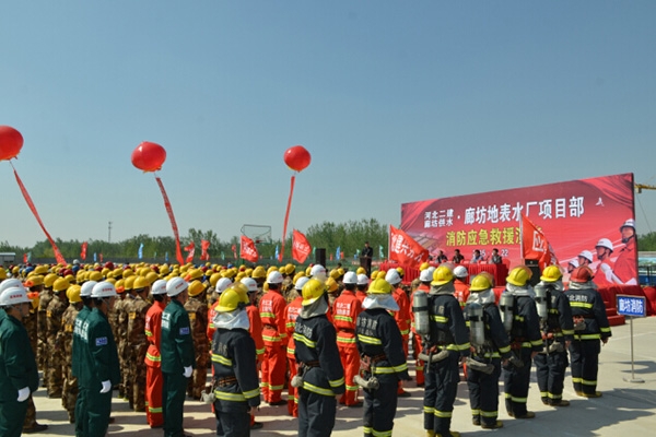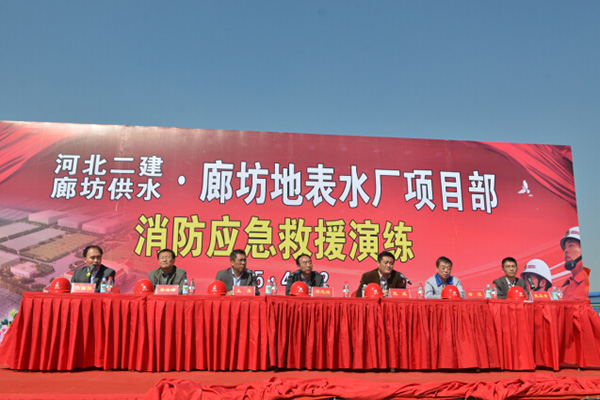 4月22日,公司廊坊地表水厂项目部开展了一场生动的消防应急救援演练活动。这是公司为了落实消防安全“四个能力”建设要求开展的一项活动。该活动得到了廊坊市安监局、建设局、消防支队、清泉供水、爱德堡医院等有关单位的大力支持,廊坊市安全生产监督管理局副局长周志海,廊坊市建设局党委委员环卫局局长武威,公司总经理、副董事长、党委副书记王勇,廊坊清泉供水有限公司总经理黄斌等领导莅临现场指导,廊坊清泉供水公司、监理单位、公司项目部、建兴劳务工人共400余人参加了活动。《河北安全生产》杂志社、《河北工人报》社、《廊坊日报》社、廊坊电视台、网易网河北频道等媒体记者到场对活动进行了采访。