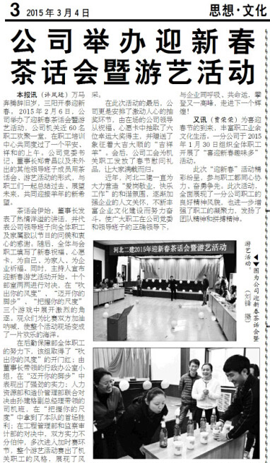 公司2015年第2期最佳文章评选结果揭晓 来源: 修改时间:2015.05.04 浏览:3547 公司2015年第2期最佳文章评选结果揭晓 根据各单位报送的评选结果并经公司评委会认真研究,2015年第2期《河北二建》和公司官方网站最佳文章是:2015年3月4日《河北二建》三版刊登的《公司举办迎新春茶话会暨游艺活动》,作者:许凤廷,单位:公司机关。 上一条 返回列表 下一条