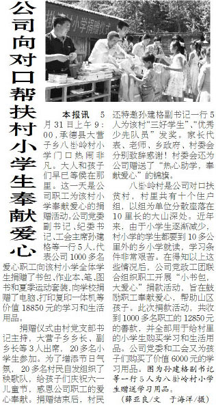 公司2015年6月份最佳文章评选结果揭晓 来源: 修改时间:2015.09.02 浏览:3438 公司2015年6月份最佳文章评选结果揭晓 根据各单位报送的评选结果并经公司评委会认真研究,2015年6月份《河北二建》和公司官方网站最佳文章是:2015年6月15日《河北二建》一版刊登的《公司向对口帮扶村小学生奉献爱心》,作者:薛亚良,单位:公司机关。 上一条 返回列表 下一条
