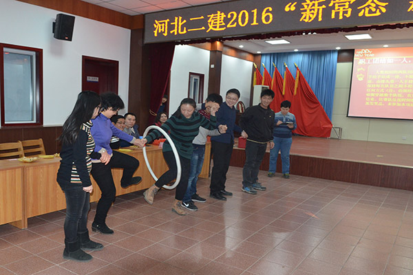 活动伊始,董事长发表了热情洋溢的讲话,并代表公司领导班子向全体职工及家属送上新年的祝福,致以节日的问候。董事长在讲话中充分肯定了公司2015年取得的成绩,他号召公司上下同心同德,携手共创辉煌的2016!同时,主持人宣布新年联欢会开始。十一个部室加之八分公司分成8支队伍,两两进行对决,在“职工团结如一人,试问天下谁能敌”、“春种一粒粟,秋收万颗子”、“莫愁前路无知己,天下谁人不识君”三个游戏中展开激烈的角逐。观众们为比赛双方加油呐喊,使整个活动现场变成了一片欢乐的海洋。