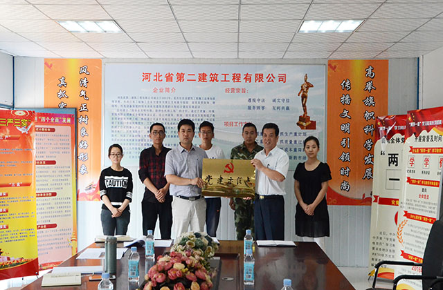 6月13日上午,河北建工集团党委副书记张庆虎、党工部部长李怀生到公司良村开发区地表水厂项目部进行“党建示范点”授牌,公司党委副书记、纪委书记、工会主席孙建格,工会副主席、政工部部长薛亚良一同参加。在听取该项目党支部书记对“党建示范点”创建工作汇报后,张庆虎书记对项目部“党建示范点”创建工作给予了充分的肯定,并表示该项目做到了项目管理与党建工作同步进行、相互融合的基本要求。