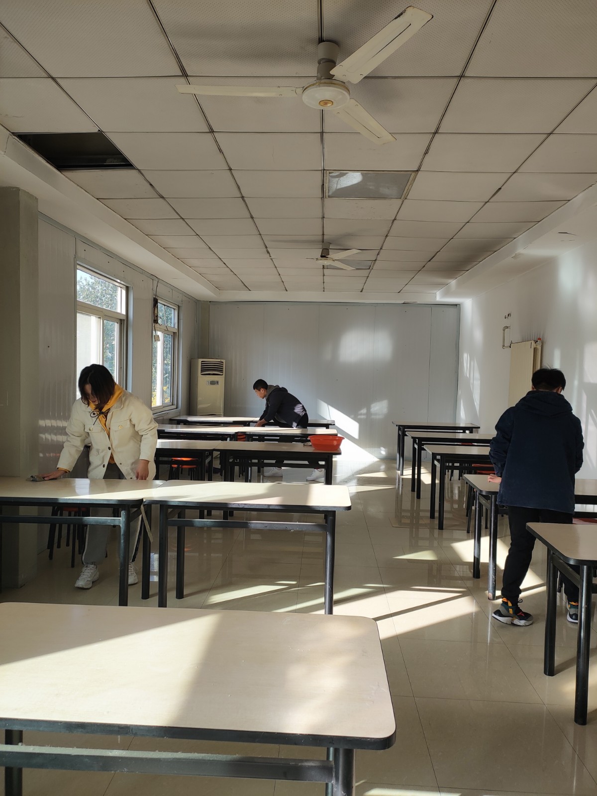 活动中,团员们积极热情、分工合作,共同对活动室、会议室以及餐厅进行了一次大清扫。他们有的扫地、有的擦桌子、有的扔垃圾、有的拖地、有的摆桌子,扫帚在团员们的手中来回摆动,犹如神龙摆尾一样,把屋子里一堆堆脏物扫去;抹布在桌子上迅速旋转,抹掉了层层灰尘,使桌子显得格外透亮;衣服上沾到灰尘,额头上流下汗水,也不能使大家停下手中的工具。团员们个个干劲十足,充分发扬了不怕苦、不怕累的奉献精神,经过大家一上午的劳作,活动室、会议室以及餐厅变得焕然一新。