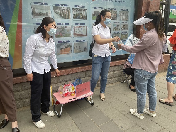 志愿者身着工装,佩戴党徽,早早来到考点,在校门口设置了爱心服务点,为考生免费提供必备文具、口罩、纸巾等物品,也为在校门外等候的家长们提供矿泉水。当看到考生步入考场时,志愿者们主动为学子助力加油,用亲切的笑容和暖心的服务为考生和家长缓解紧张情绪。