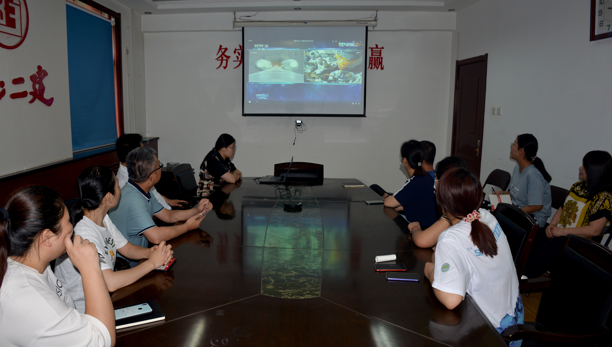 上午9点,综合办负责人就把会议室打开,把电脑、投影仪、音响准备好,切入中央电视台直播画面。9点10分,机关18名职工陆续来到会议室,期待着神十二发射的瞬间。看着视频里回放的聂海胜、刘伯明、汤洪波3名航天员出征的画面,大家边聊边看。9点22分27秒,火箭点火成功,大家目不转睛的盯着屏幕,注视着飞船升空的每一个瞬间。抛弃逃逸塔、助推器分离、整流罩分离、火箭主发动机熄火、箭船分离、太阳能帆板展开,每一个步骤的完美进行,都让在场的职工不由自主的鼓起掌来。