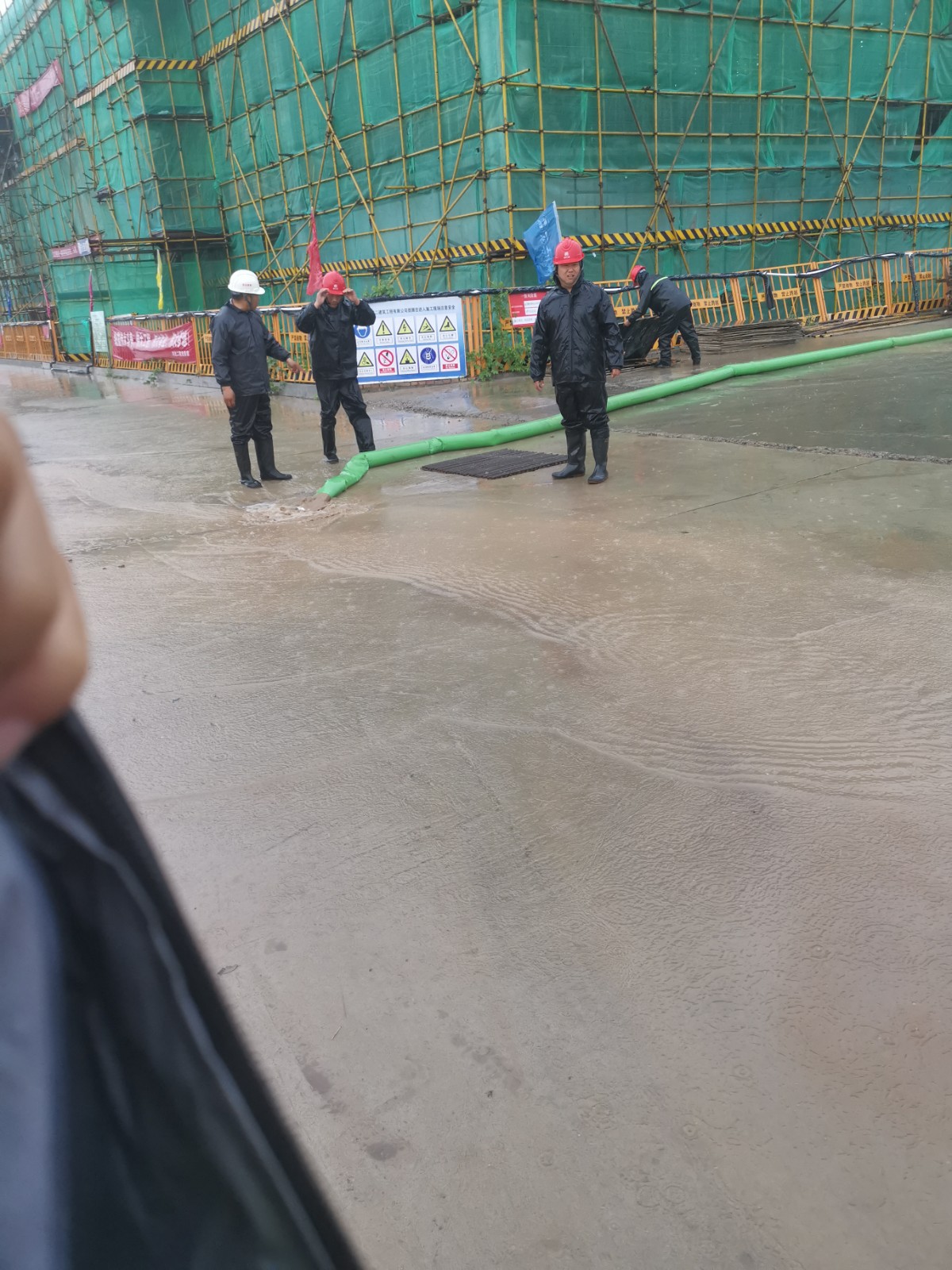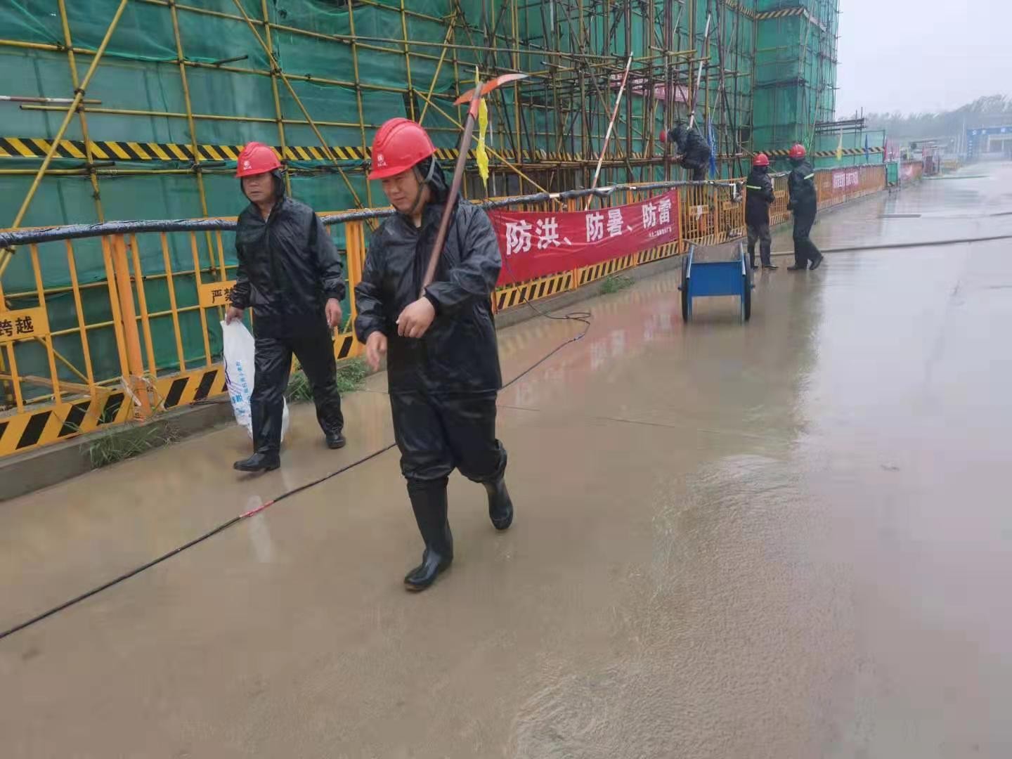 7月12日一早,面对前一天晚上的强降雨影响,项目经理董云鹏组织全体人员于会议室开展此次防汛会议,“一定要检查基坑、膜池外脚手架、临时用电!在检查临电时,一定要戴好绝缘手套,防止发生事故!拿好铁锹、准备好抽水泵我们走!”全体职工穿戴好雨衣、雨鞋,佩戴好安全帽深入施工现场。大家阔步向前,任凭雨水拍打着脸庞,丝毫不退却,撸起袖子加油干,顺利完成了各项检查,最大程度地排除了各种隐患。