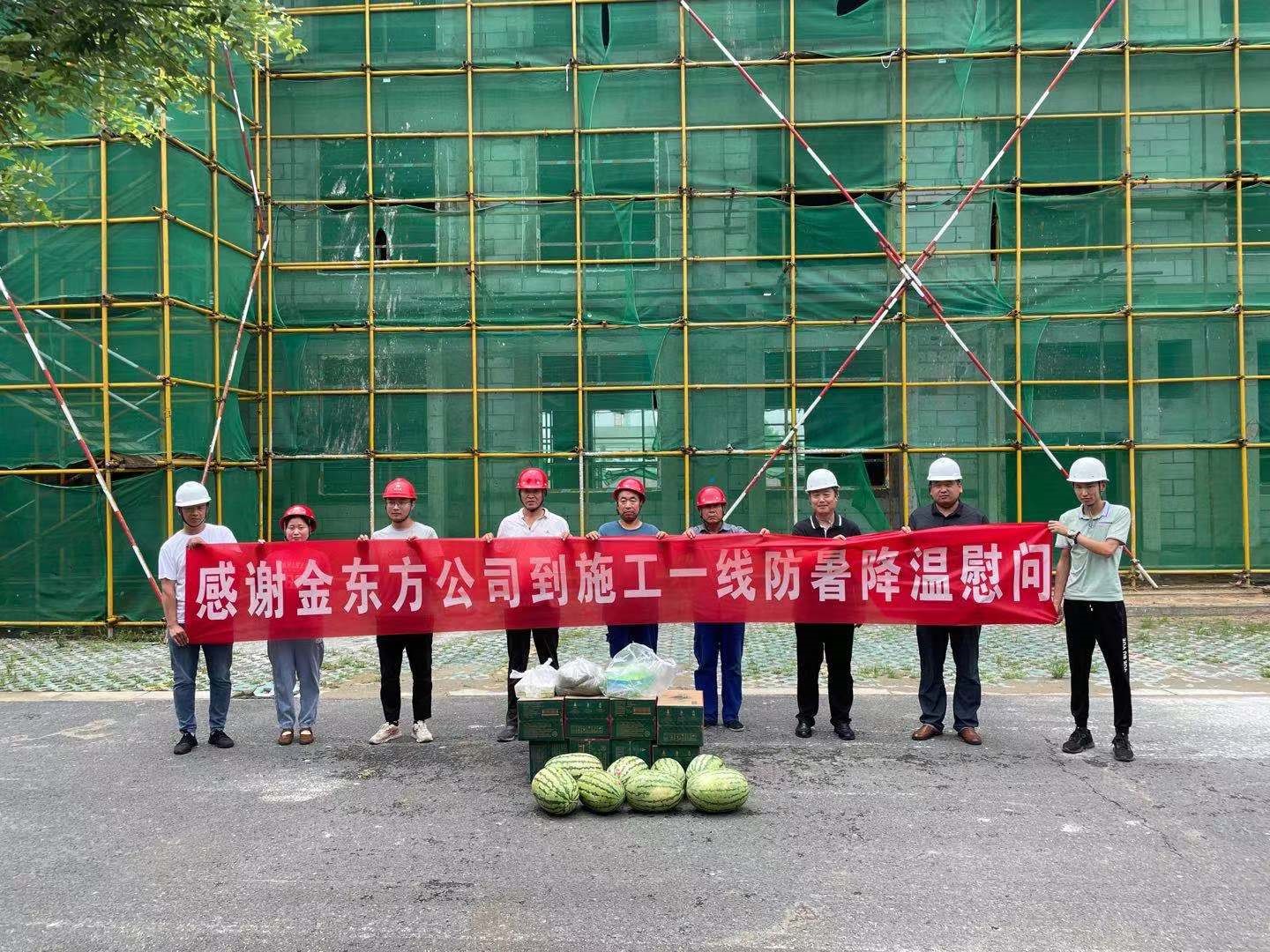 慰问组一行认真了解管理人员和工人们在高温天气下的工作及生活情况,并代表金东方公司对他们在高温下坚守岗位、忠于职守的精神表示衷心的感谢。另外,要求并叮嘱现场作业人员在夏季高温作业时一定要注意安全,不要疲劳上岗,以良好的精神状态完成夏季的任务,落实好高温天气作业的相关保障措施。同时,慰问组为现场管理人员和工人们送来了矿泉水、绿豆、西瓜、藿香正气液等防暑降温物资。