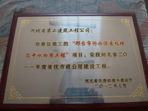 三分公司 邢台市污水深度处理及中水回用工程喜获河北省优质市政公用建设工程#Black 来源: 修改时间:2012.09.20 浏览:3368 三分公司 邢台市污水深度处理及中水回用 工程喜获河北省优质市政公用建设工程 2012年9月19日,河北省市政工程协会在石家庄市美丽华大酒店举办了第六届会员大会。会议期间,协会表彰了21个荣获河北省优质市政公用建设工程,其中由省二建三分公司施工承建的“邢台市污水深度处理及中水回用工程”喜获河北省2011年度省优市政公用建设工程。 该工程位于邢台市东北部,现有污水处理厂内预留用地处,深度处理规模为10万吨/日,中水回用6万吨/日,于2011年7月份竣工投入使用。(郭澜) 上一条 返回列表 下一条