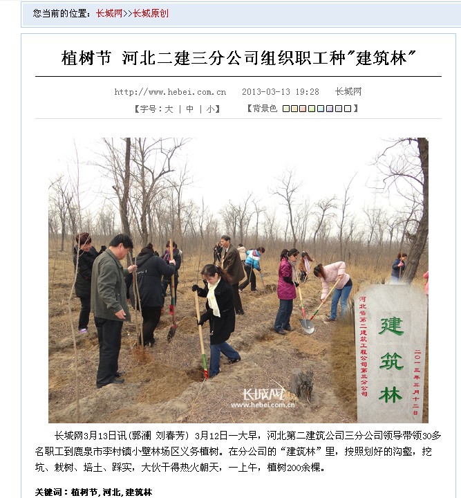 长城网报道我公司种植“建筑林”#Black 来源: 修改时间:2013.04.08 浏览:7023 长城网报道我公司种植“建筑林” 2013年3月13日,长城网长城原创栏目以《植树节河北二建三分公司组织职工种"建筑林"》为题,报道我公司义务植树情况和建造自己的特色林“建筑林”情况。 以下是引用片段: 上一条 返回列表 下一条