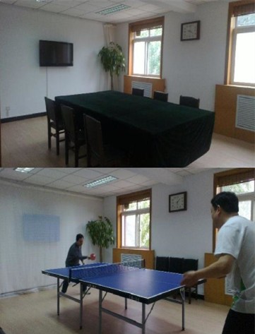 以前广和公司缺少职工活动的固定场所,职工日常文体活动大多要借用或租用外部场地,为活动长期稳步开展带来不便,同时也增加了各项费用的支出。针对这种情况,广和公司工会通过认真研究,决定对原有会议室进行改造。崭新的多功能活动室,东侧墙面架设液晶电视机并接上了网线,可以方便职工看电影和浏览网页,接上麦克还可以K歌;地面铺设优质橡胶地板既能满足文体活动要求,又能够减少对噪音影响。地板采用木纹色彩,在作为会议室使用时整洁美观;墙面粉刷后在两端加设了纱帘来防止体育活动是对墙面的污染;中间架设一面乒乓球台,职工日常可以每天活动,在会议时去掉球网并加盖会议桌布能够满足办公使用的要求。改造完成的多功能活动室,整体上简洁明快、紧凑合理,将现有资源有效利用。